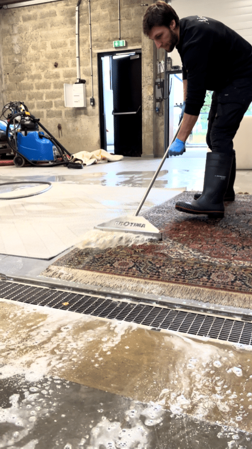 Notre intervention consiste en un nettoyage complet et minutieux de vos tapis, réalisés dans un atelier équipé d’un sol en béton avec système de drainage, garantissant un environnement optimal pour un travail soigné. Les tapis, notamment les modèles décoratifs comme les tapis persans, sont traités avec des outils spécifiques tels que des extracteurs d’eau, des raclettes professionnelles et des équipements d’extraction performants. Chaque étape du nettoyage est effectuée avec soin, depuis le prélavage jusqu’à l’extraction de l’eau, afin d’éliminer les taches, la poussière et les allergènes sans abîmer les fibres délicates. Nos techniciens qualifiés portent des équipements adaptés, comme des bottes et des gants, pour assurer une manipulation sécurisée et hygiénique des textiles. Ce nettoyage en atelier garantit un résultat plus profond et durable que les interventions sur site, idéal pour redonner vie à vos tapis dans la région de Caen.